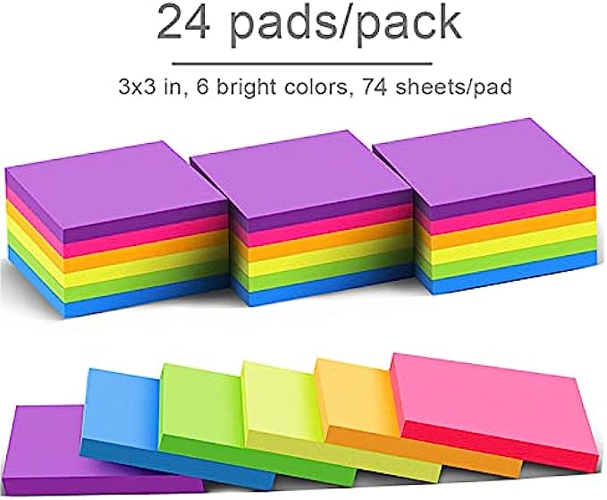 (24 Pack) Sticky Notes 3x3 in Post Bright Stickies Colorful Super Sticking Power Memo Pads, Strong Adhesive, 74 Sheets/pad