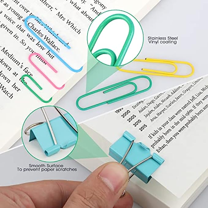 • High quality: Paper clips and binder clips for school supplies office supplies are made of high-quality metal return needle is made of vinyl coating, corrosion resistance and smooth surface to prevent paper scratches. Rubber Bands are made of natural rubber for smooth, stretchability, re-usable. Cute office supplies teacher supplies decorate your busy and tired life.