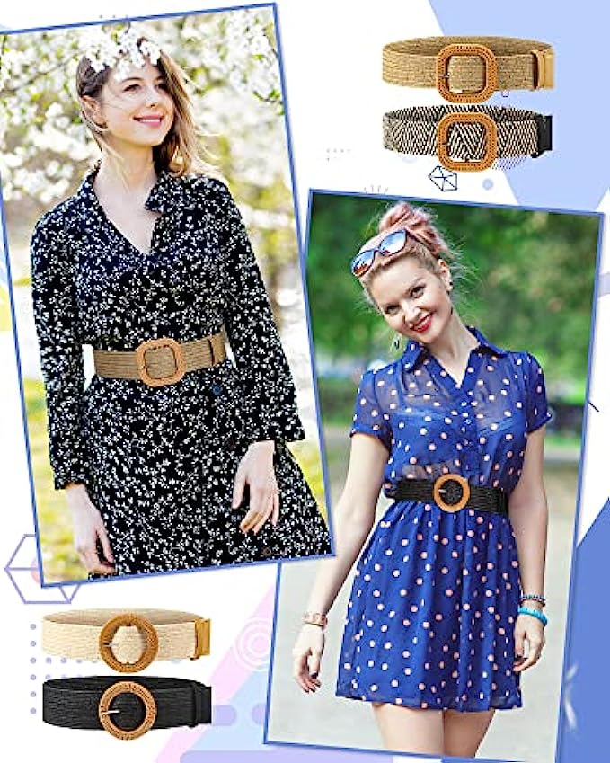 4 Pack Straw Woven Elastic Stretch Waist Belt Women Skinny Dress Belt Wooden Buckle Waist Dress Band