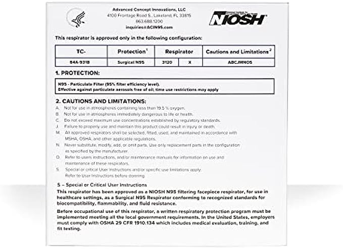 ACI N95 Respirator Box of 50 NIOSH Approved - Made in USA