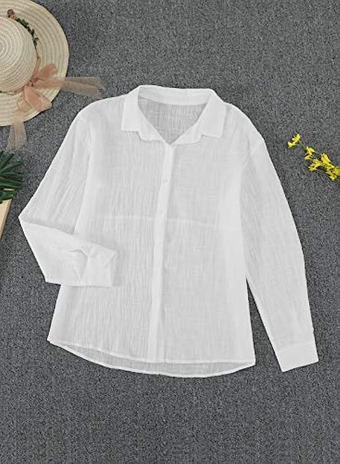 95% Polyester, 5% Spandex Imported Button closure Hand Wash Only Features: Long Sleeve, Collared V Neck, Roll-up Sleeves, Button Down, Solid Color Design It is a super soft blouse, loose, lightweight, breathable, skin-friendly Occasions: Perfect for your daily wear, outdoor activity, dates and parties... any occasion is perfect in Spring, Summer, Fall and Winte