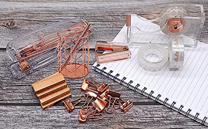 • 【Package Include】1x rose gold stapler + 1x rose gold Staple Remover+ 1000x Staples+ 12x Binder Clips+ 1xTape Dispenser+ 3x Cute Transparent Tape + 1x Pen+ 1x Pencil Cup.