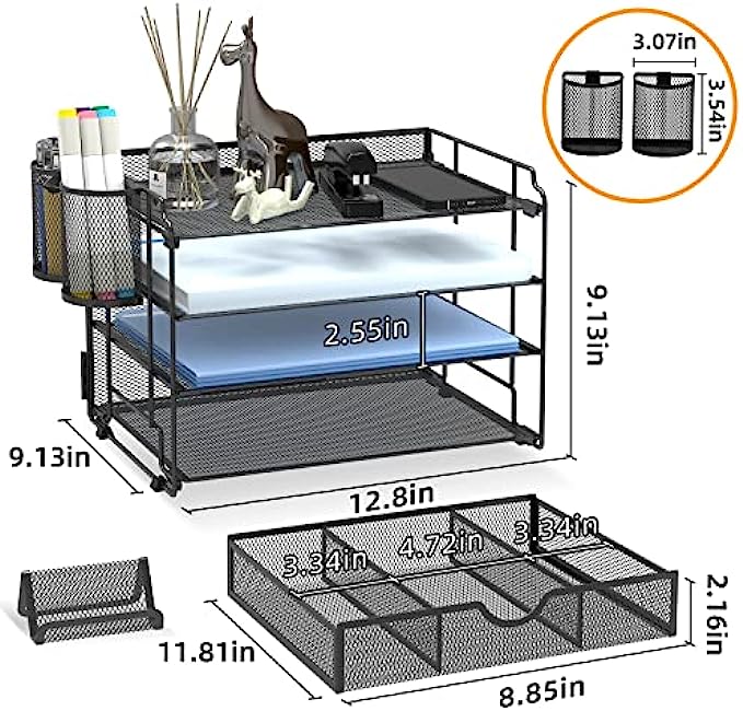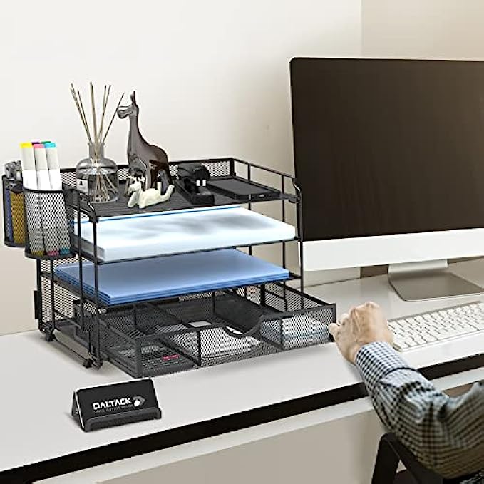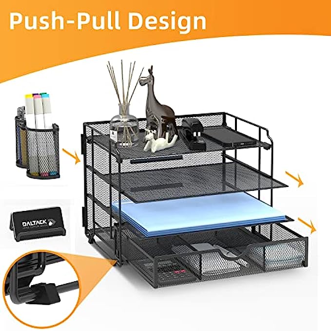 DALTACK 4-Trays Desktop File Organizer with Pen Holder,Letter Tray Paper Organizer with Drawer and Pen Holders,Black Mesh Office Supplies File Holder,Desk Organizer for Office School Home