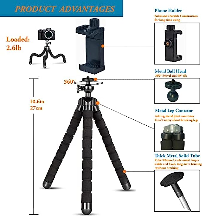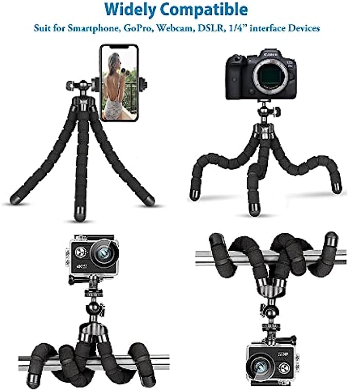 • 【Flexble Tripod】Design of OCTOPUS legs can be twisted into any shape, wrap it on tree, bike, lamp, chairfor extra variety in shot compositions and framing