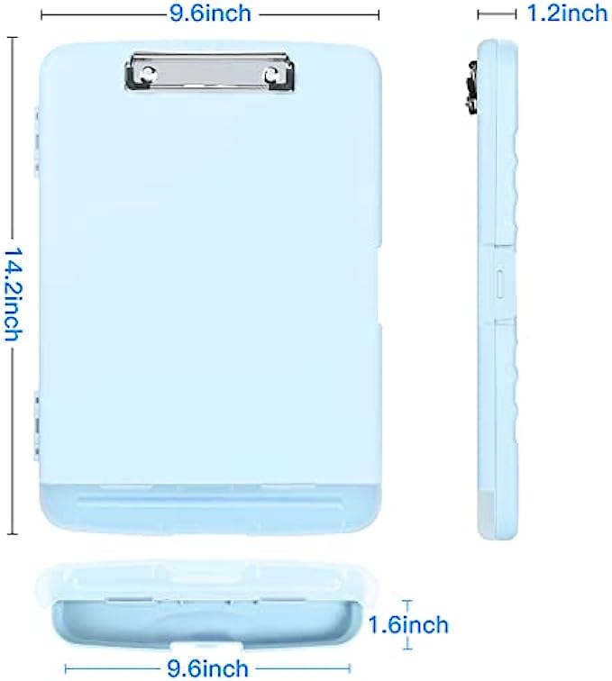 • 【Clipboard with Storage】This clipboard includes 2 compartment, One for storing A4 paper, book, invoices, paperwork and more, the other for holding pens, pencils, rules, paper clips etc. Clipboard size: 9.6 x 14.2 x 1.2 inch, Paper compartment size: 9.6 x 12.5 x 1.2 inch, Pen compartment size: 9.6 x 1.3 x 1.2 inch.