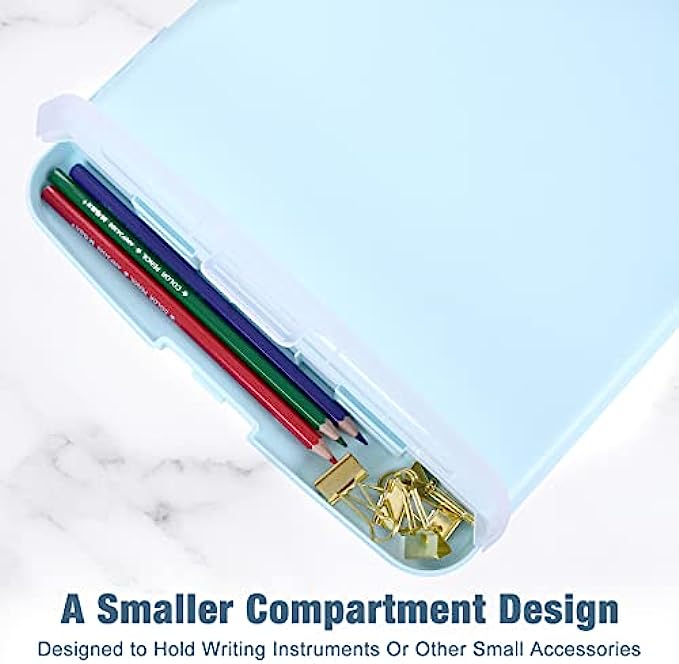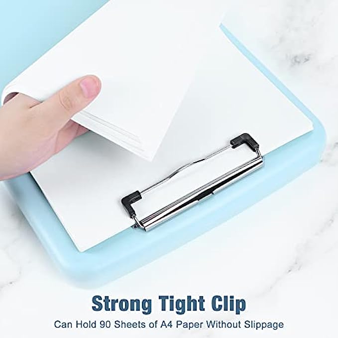 • 【VERSATILE Clipboard】The clipboard surface is smooth, Perfect for writing. The Heavy Duty Low Profile clip can hold 50 sheets of paper. 1.25 inch storage compartment can hold A4 size paper ups to 150 sheets. It also has a separate compartments for pencil or pen. Base latch that stays securely closed so your papers stay put and won't get damp.