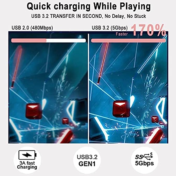 High-Speed Transfer & Faster Charging: USB 3.2 Gen1 Cable up to 3A charging speed and 5Gbps transfer speed, its transmission is faster and more stable. Your headsets can be charged while playing and you can enjoy the lower delay while playing.