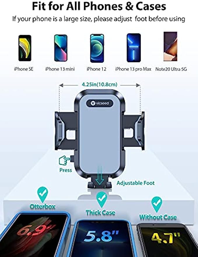 • One-Hand Operation: The car mobile phone holder also features a One-button release system that enables you to lock or release your phone with just one hand operation.Fit well for all mobile phones between 4''-7''in width and most thick case.