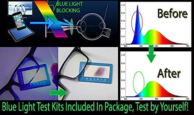 • ✅ ANTI BLUE LIGHT GLASSES WITH CASE & BLUE LIGHT BLOCKING TEST KITS ★ What's In Package: 1x Blue Light Blocking Glasses, 1x Blue & UV Led Light & Tester, 1x Glasses Case, 1x Cleaning Cloth. BUY WITH CONFIDENCE, TEST BLUE LIGHT GLASSES BY YOURSELF! Comfortable Visual Experience: Get The Difference Feel By The End Of The Day